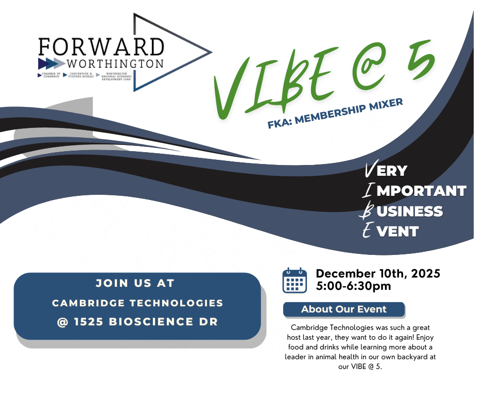 You’re invited to our next **VIBE @ 5** — our rebranded membership mixer — hosted by **Cambridge Technologies** in Worthington! **Date:** Wednesday, December 10, 2025 **Time:** 5:00–6:30 p.m. **Location:** Cambridge Technologies 1525 Bioscience Dr., Worthington Cambridge Technologies was such a gracious host last year that they’re opening their doors to us again. They’re an **animal health leader right in our own backyard**, and this is a great chance to see their space, learn more about what they do, and connect with their team. They’ll be providing **food and drinks**, so just bring yourself, your business cards, and your curiosity. VIBE @ 5 is a relaxed, come-and-go event—perfect for making new connections, catching up with fellow members, and winding down the day. Please mark your calendar and plan to join us at Cambridge Technologies for VIBE @ 5!Images